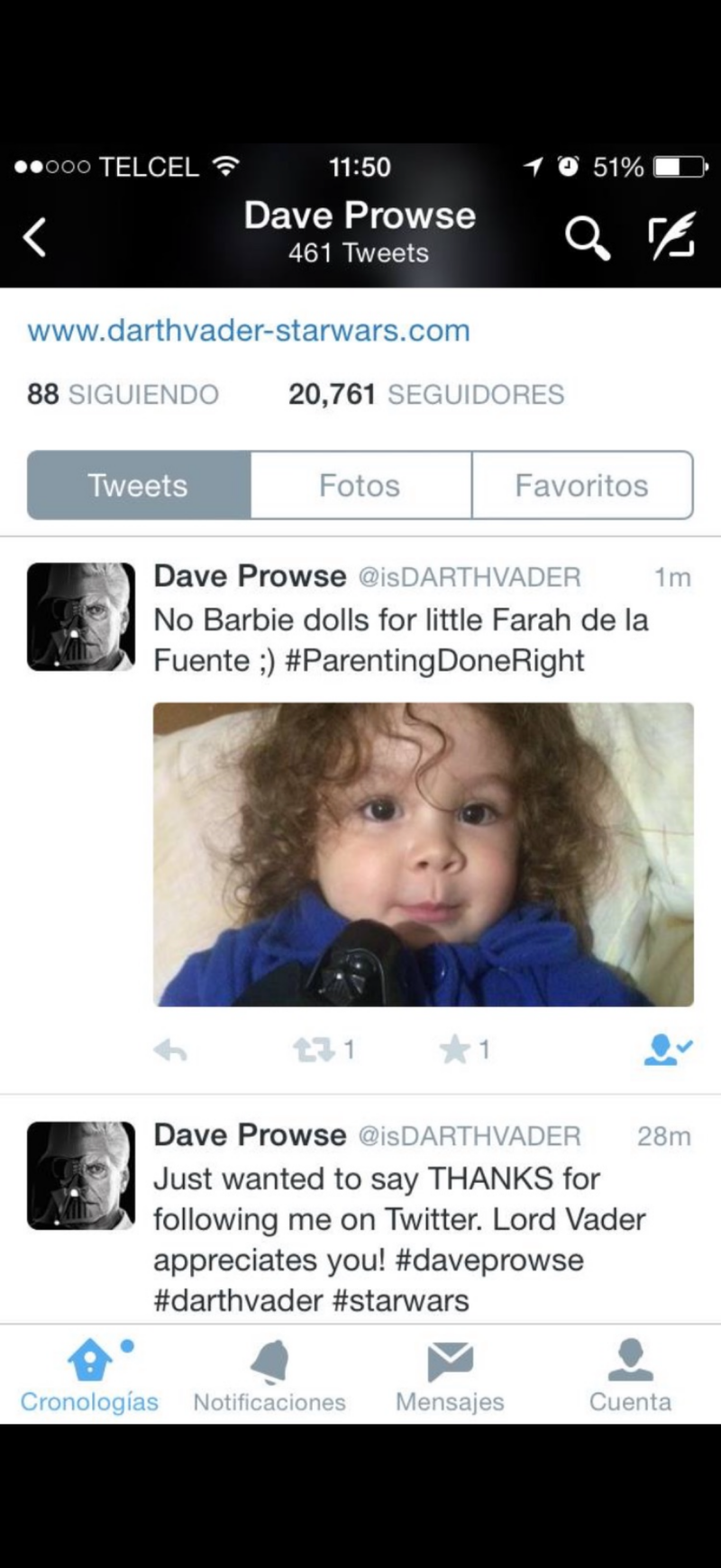 Hasta que un día apareció una respuesta: “What’s your daughter’s name?” Así. Sin agua va. Frío como el lado oscuro. No podía dejar de leerlo con la voz que tenía en la película, que por cierto no era la de él. En post producción George Lucas cambió su voz por la icónica voz de James Earl Jones. Para mí fue como si Darth Vader me hubiera invitado al lado oscuro."Join me..." escuchaba en mi cabeza. Claro que le contesté de inmediato con una emoción de niño. Y otra vez silencio. Para mí eso ya era una gran hazaña un acercamiento al mismísimo lado oscuro de la fuerza. Pensé que ahí había quedado la cosa. Que había sido ese pequeño gran destello. Pero no. Días después, ocurrió algo que todavía hoy me hace sonreír y me vuelve a ilusionar como cuando fui aquella tarde-noche con mi papá a ver El retorno del Jedi. Dave Prowse publicó la foto de mi hija con una frase que, en ese momento, lo dijo todo: